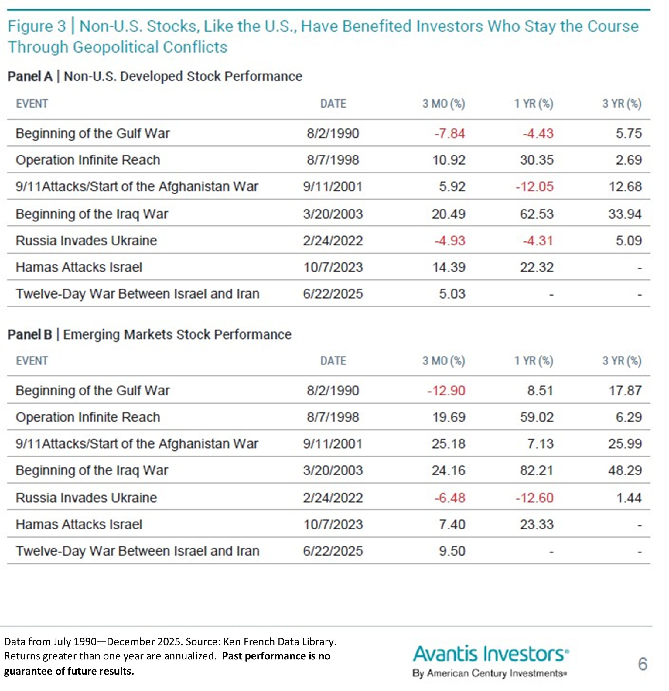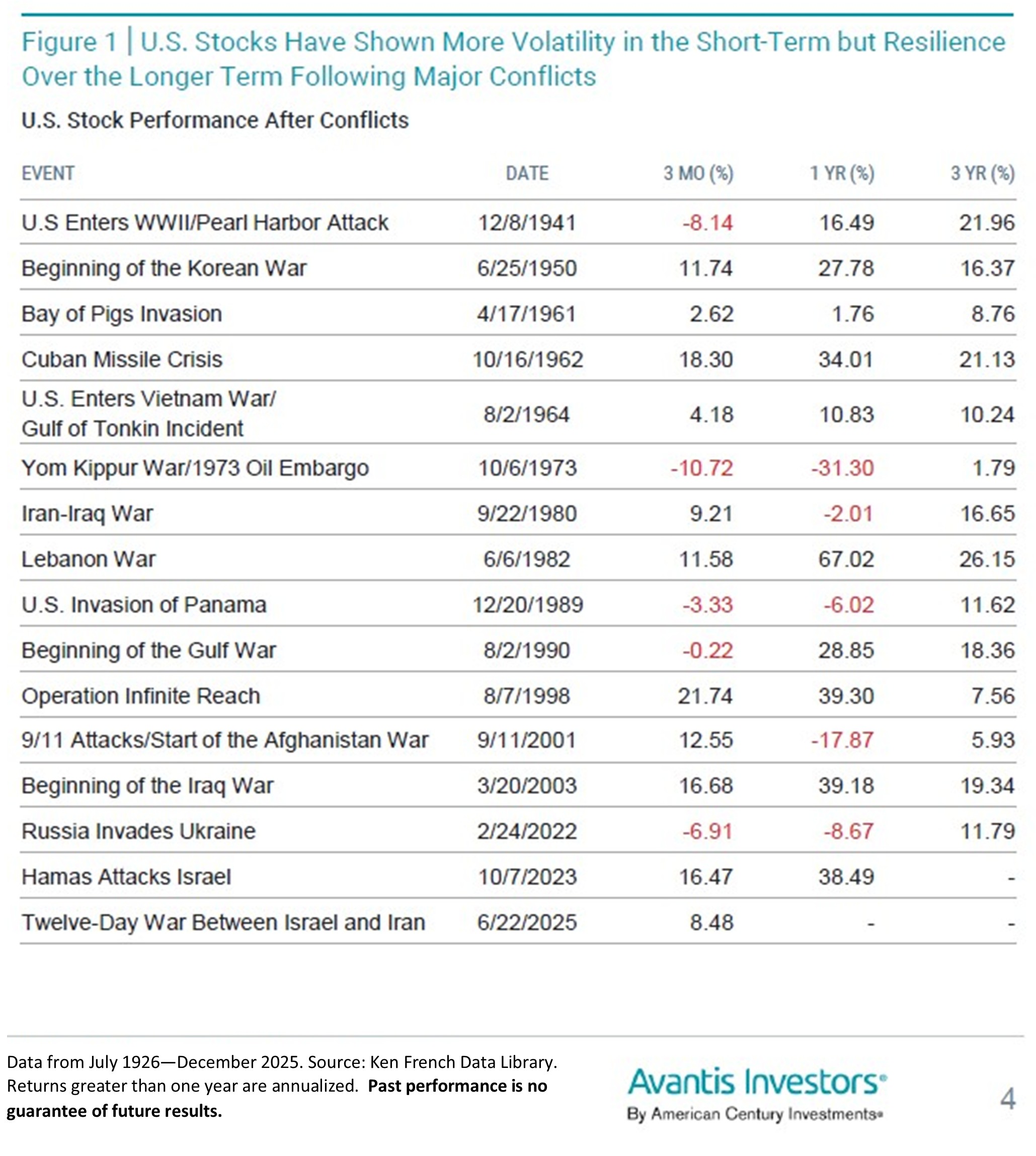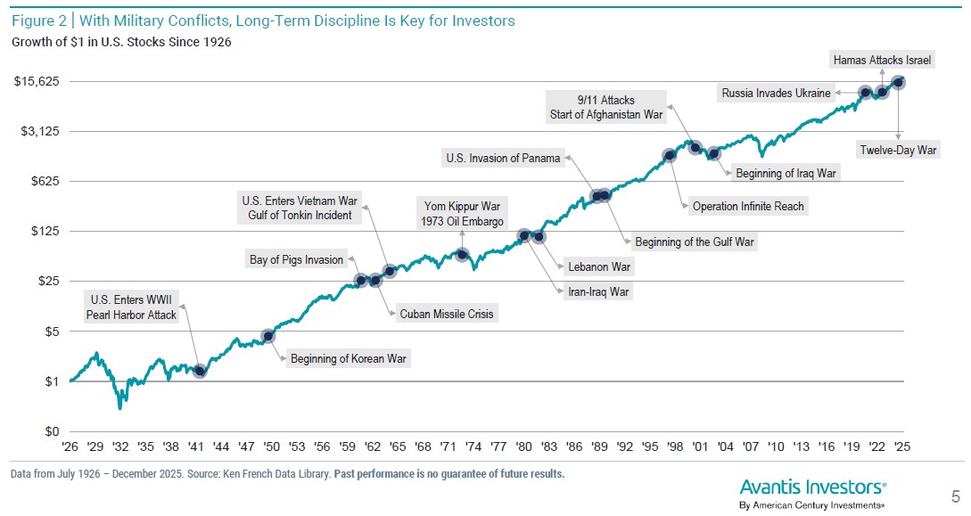 Investor Perspective: When geopolitical conflicts escalate, investors naturally worry about what it means for markets. Research examining nearly a century of market history shows that U.S. stocks produced positive returns in every three-year period following the start of the major military conflicts studied, with an average annualized return of roughly 13%.